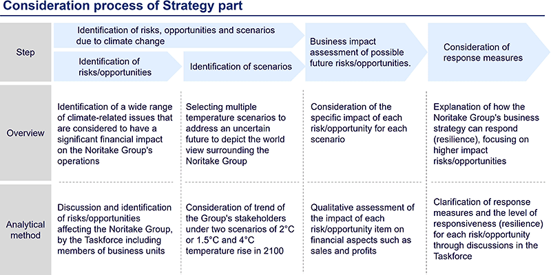 Going forward, the newly established Risk Management Committee in 2024 will take over these initiatives. The Committee analyzes and evaluates all risks of the Noritake Group, including climate change, identifies key risks, and manages initiatives to avoid or mitigate them.