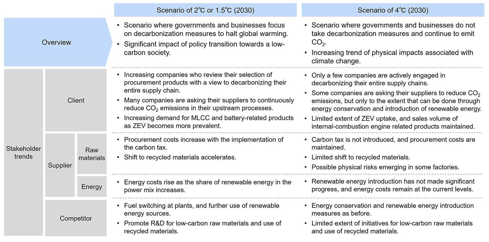 Our Group has examined risks and opportunities based on two scenarios: the “risks related to the transition towards a low-carbon society” which would occur during the progression to the 2°C or 1.5°C scenario, and the “risks related to the physical impacts associated with climate change” which would arise if the global fails to achieve adequate climate change mitigation measures and reaches the 4°C scenario.