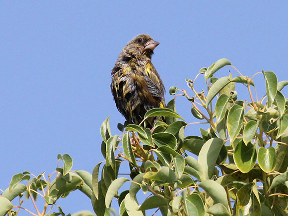 全身が緑がかった茶色で、やや地味ですが、翼の黄色い斑が飛ぶとよく目立ちます。植物のタネなどが好きで、ヒマワリのタネも、クチバシで上手に殻をむいて食べます。