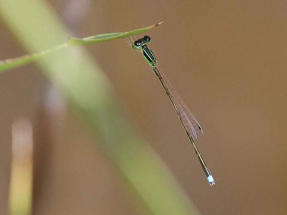 非常に細く小さいトンボです。尾のように見える腹部の先端にある青い斑が目立ちます。