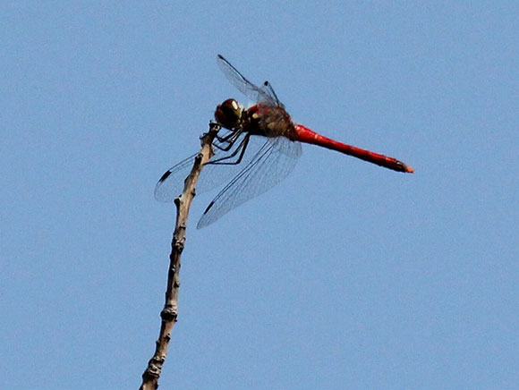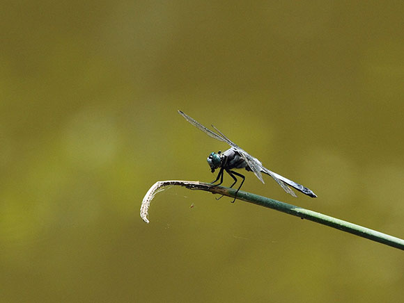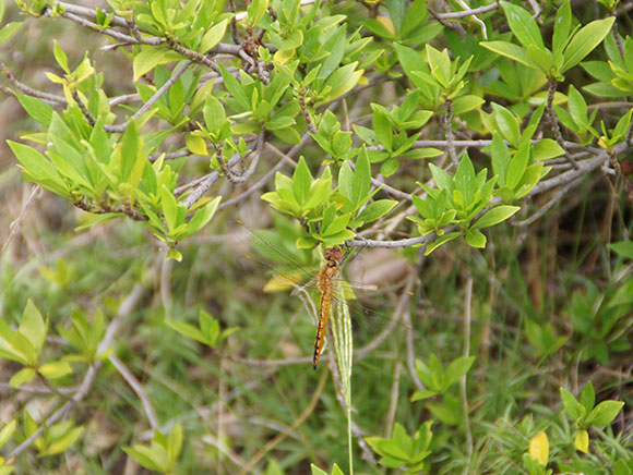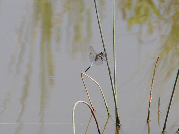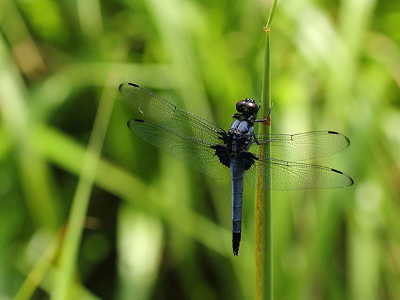 シオカラトンボと大きさは変わりませんが、青みが濃く、オスの羽の付け根は黒くなります。水辺でメスが産卵する際に、オスは近くで見張ることもあります。