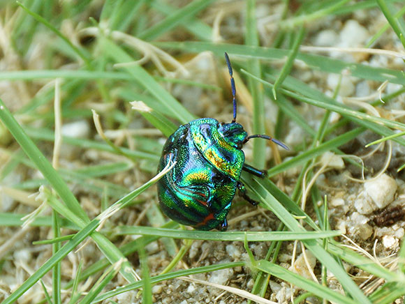 金属光沢が非常に美しいカメムシです。幼虫はツゲで育ちます。本来は分布が限られたカメムシでしたが、ツゲが植えられた公園などでは見られることがあります。幼虫で冬を越し、翌春に成虫になります。