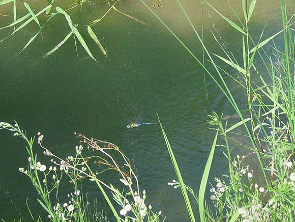 有名なギンヤンマによく似ていますが、胸に黒い線があるのが特徴です。腹部(尾にみえるところ)が黒く、オスには青い点がたくさんついてきれいです。
