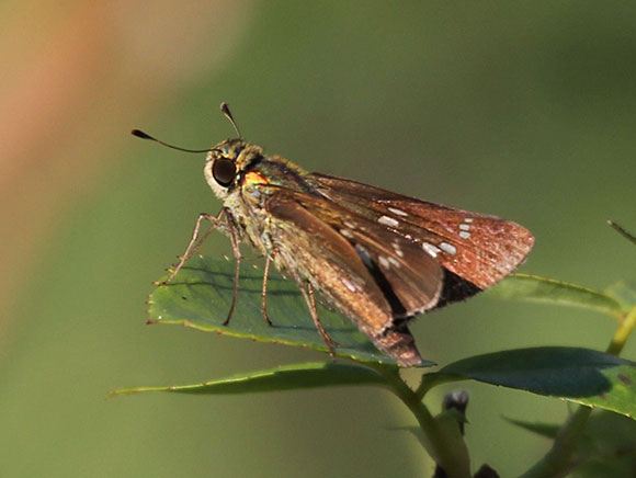 茶色く、ガのような姿をしていますが、チョウの仲間です。名前は、後バネにある白い斑が一列に並んでいるところに由来しています。幼虫はイネ科の植物を好み、ススキやエノコログサの葉を食べて育ちます。