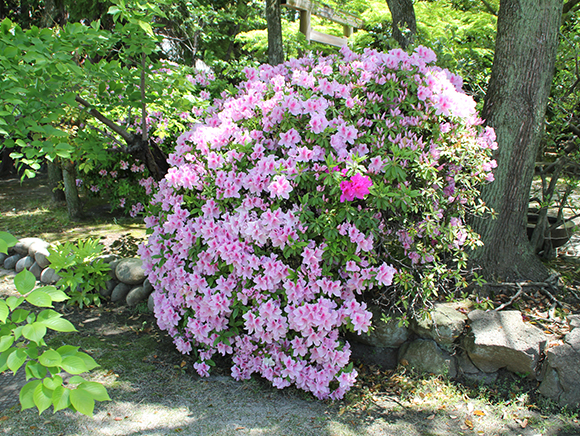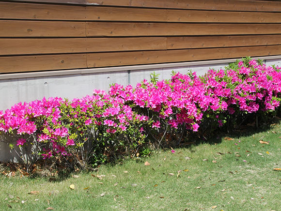 長崎県平戸で栽培されていた大形ツツジの品種の総称です。ヒラドツツジの品種の中では、オオムラサキがよく知られています。春に赤紫色をした大きな花をたくさん咲かせ、ノリタケの森では敷地内の道沿いを鮮やかに彩ります。