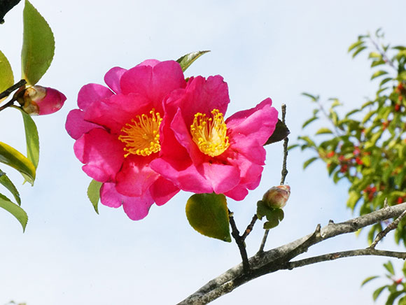 日本固有のツバキの仲間です。オトメツバキやタチカンツバキなど、品種がたくさんあります。秋から冬にかけて咲く花にはメジロやヒヨドリなどの野鳥が蜜を舐めに訪れます。花片(花びら)に小さな穴があれば、メジロたちの足跡の可能性があります。