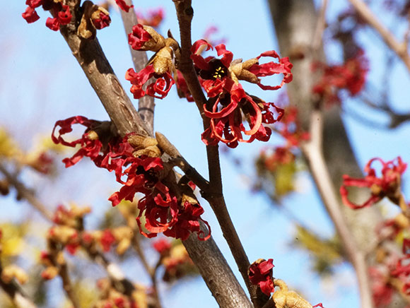 春、葉をつける前に黄色の花をたくさん咲かせます。名前は花の多い様子から「満作」という説と、春に「まず咲く」がなまってマンサクになったという説もあります。花が咲く時まで昨年の葉が枯れたまま残るものは、中国原産のシナマンサクです。