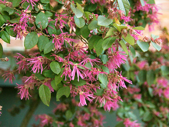 中国原産の変種のアカバナトキワマンサク(別名:ベニバナトキワマンサク)と共に、生垣や庭木などでよく使われています。トキワマンサクは白色の花を咲かせ、葉は緑色ですが、アカバナトキワマンサクは紅色の花を咲かせ、葉も赤みがあります。