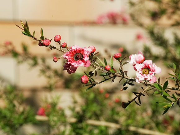 オーストラリアやニュージランドに分布し、日本でもよく植栽される小低木です。日本では高さ5mほどに育ちますが、原産地では10m以上になります。英名は"tea tree"で、移住者がこの木の葉をお茶の代用としたことに由来するそうです