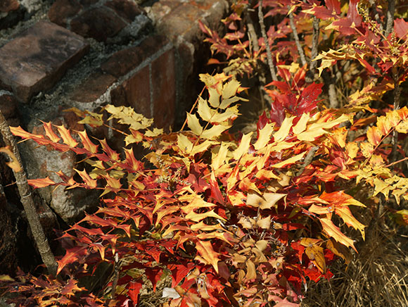 中国やヒマラヤ原産のヒイラギのような葉をつける低木です。庭木や公園樹としてよく植えられ、冬の終わり頃に黄色い花を多数咲かせます。夏になると、白い粉をつけた濃い紫色の果実が熟します。