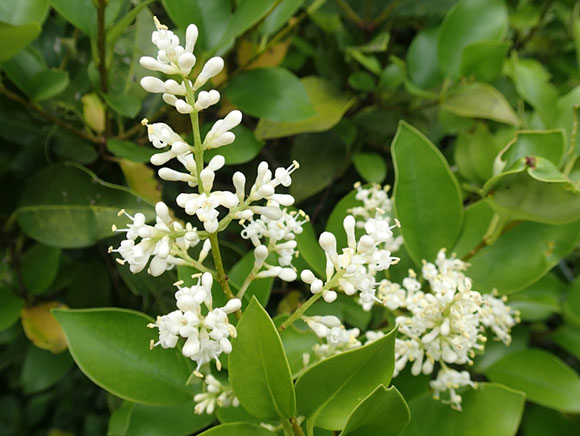 果実の色や形がネズミのフンに似ていることから名づけられました。良く似たトウネズミモチは外来種で、都市部などで広がって問題になっています。白い花には、多くの昆虫が集まります。別名タマツバキ。