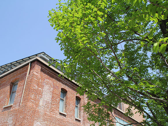 ノリタケの森では噴水ひろばの近くにある「せせらぎ」で、春から夏にかけては鮮やかな緑に、秋は落葉を前にレンガ色に彩られるメタセコイアを見ることができます。