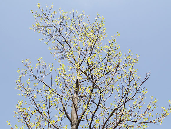 アメリカで「チューリップツリー」と呼ばれている木。春、木を見上げると、クリーム色のチューリップのような形をした大きな花が咲いています。また、「ハンテンボク」という別名があり、葉の形が衣類の半てんのような独特な形をしています。