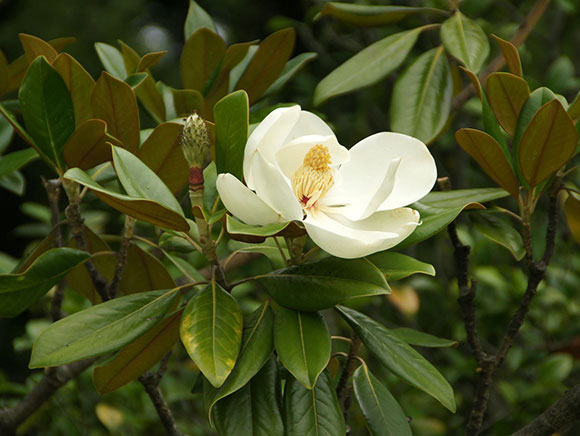 深緑色をした厚みのある大きな葉をつける木ですが、その中で春には直径20cm前後の大きな白い花を咲かせます。高木である上に、花は枝先につくため、なかなか間近で見る機会はありませんが、花はとてもいい香りがします。