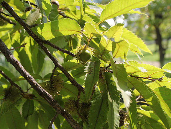 デコボコとした大きな果実の形が、握りこぶしに似ていることが名の由来です。秋に果実が熟して裂けると、中から白い糸をひいて真っ赤なタネが垂れ下がります。それを食べに鳥が来ることもあります。