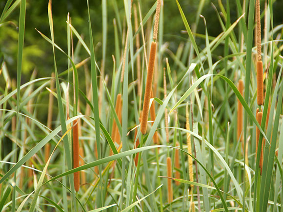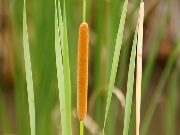 夏には、水面から伸びる葉と一緒に、細長いソーセージのような茶色い穂がよく目立ちます。秋、熟した穂から白い毛を生やした小さなタネが次々に風に乗って散ります。