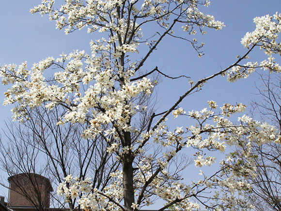 春、葉を開く前に大きな白い花をたくさん咲かせます。