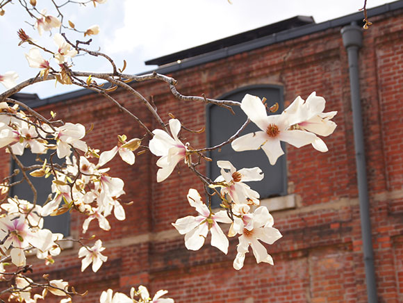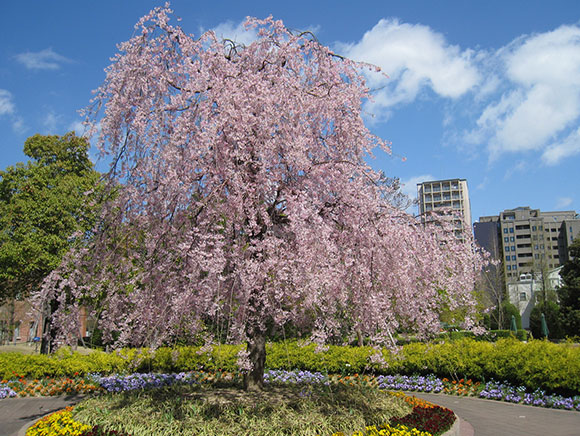 満開となったイトザクラの枝が風になびく様子は、とても優雅な光景です。ノリタケの森ではクラフトセンター前で見ることができ、当施設の象徴的な木です。
