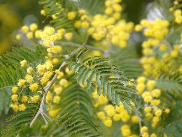 「ミモザ」という別名で親しまれている木です。まだ寒風が吹く2~3月頃、鮮やかな黄色い花がたくさん咲きます。満開になると木全体が黄色く見えるほどで、ノリタケの森でもこの時期はよく目立ちます。