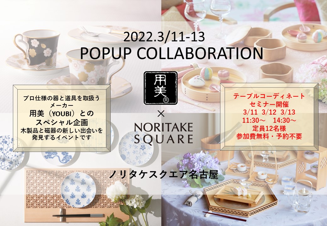 ノリタケスクエア名古屋では3月11日(金)~13日(日)までの3日間、プロユースの器や木製品を取り扱うメーカー用美(YOUBI)とのPOPUPイベントを開催します。