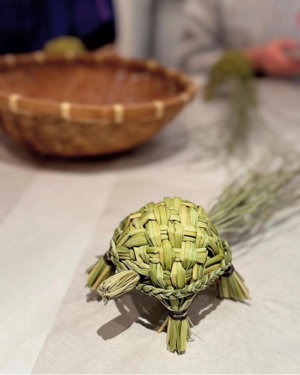 今回のワークショップでは、今年愛知で収穫された香り高い青藁を使って、長寿を尻尾の長さで表現した「松の舎」さんオリジナルの亀を作ります。