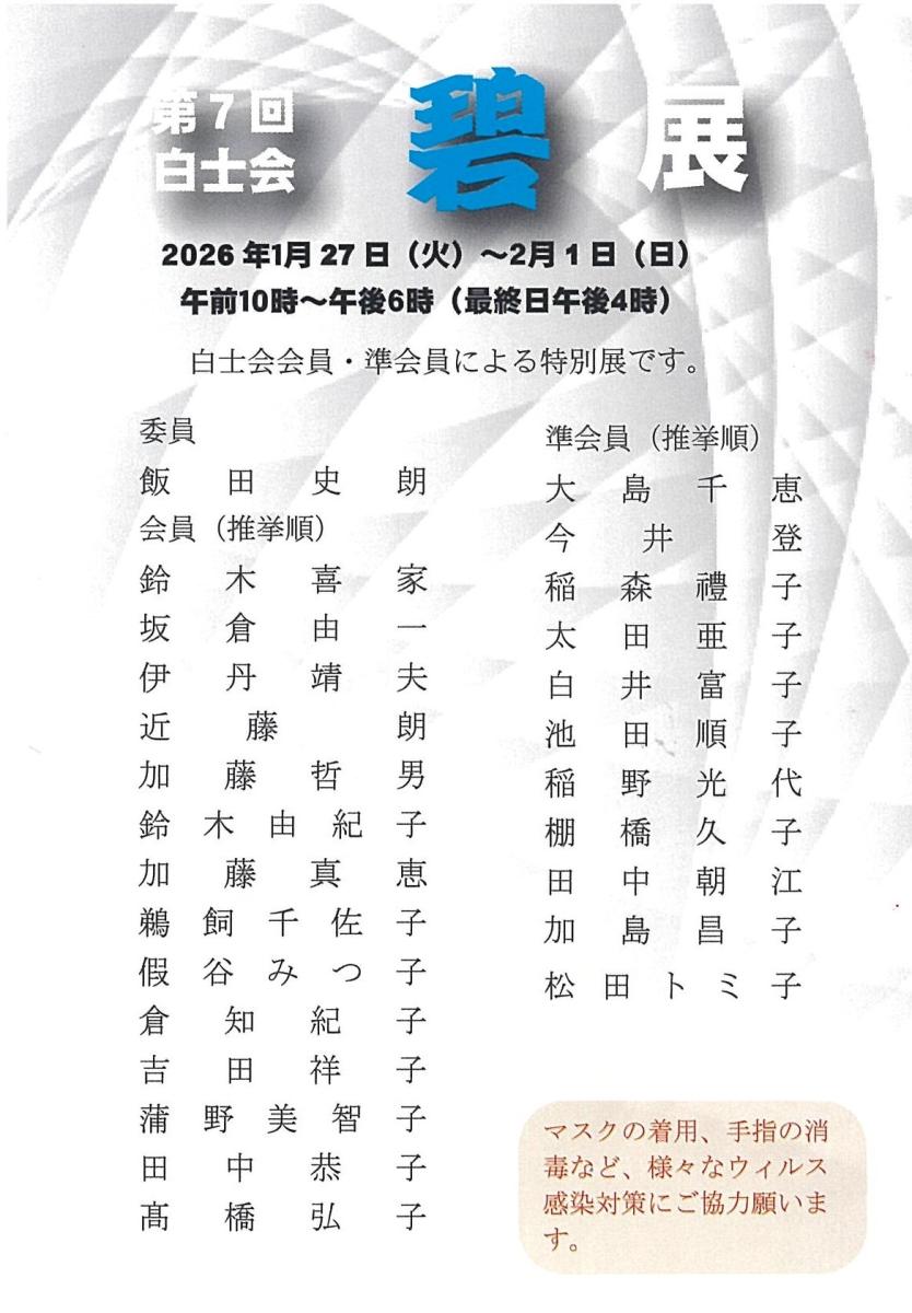 私たち白士会は創立以来60余年、常に従来の日本画の概念に捉われない自由な立場での作品作りを目指してきました。創立会員から新しい世代の作家まで、様々なモチーフで30号~50号と小品を1点ずつ展示します。年に2度の公募展とは違った、それぞれの作者の世界をお楽しみください。