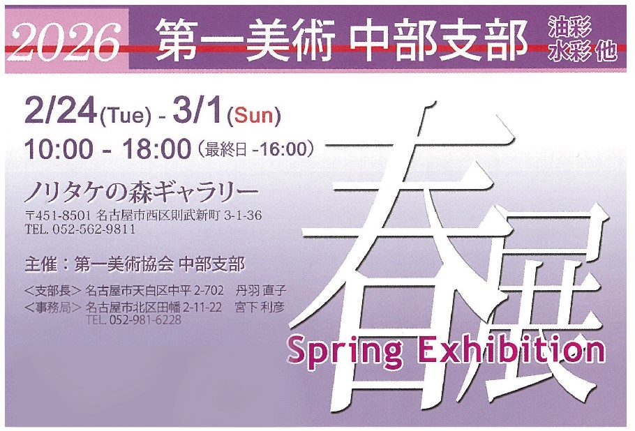 毎年恒例となったノリタケの森ギャラリーでの春展は、第一美術の中部支部の支部員と研究員による50号から小品までの自由な形の展覧会です。それぞれが日頃より感じたものを感じたままに描いたバラエティ豊かな作品を楽しんでいただけると思います。 さぁ今年も!という意気込みをご覧ください。 主催:第一美術協会 中部支部