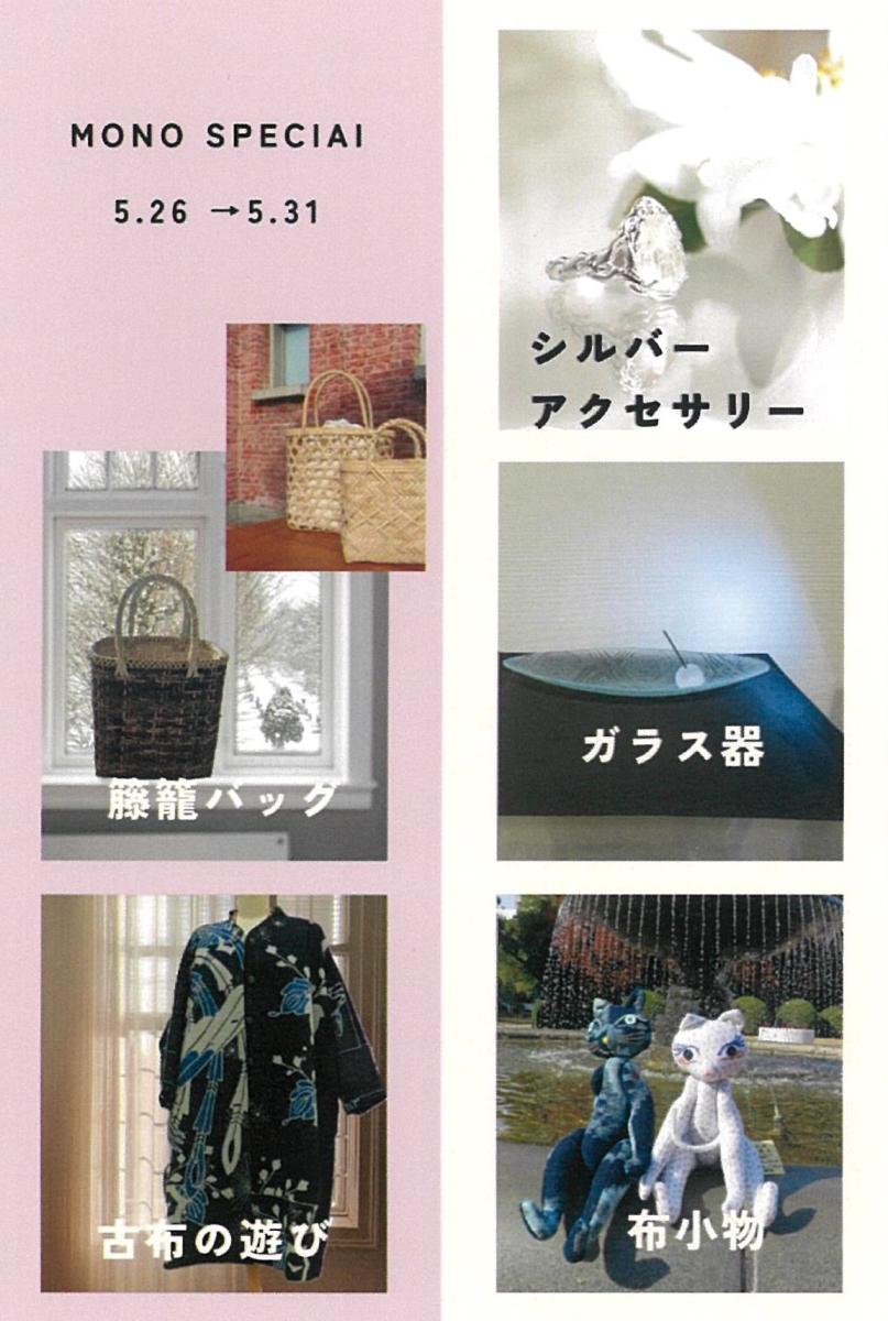 古布の洋服、シルバーアクセサリー、布小物、藤籠バッグ、ガラスの器 異なる素材と手仕事から生まれた5つの個性。 《モノ・スペシャル》として並びます。 見て、触れて、確かめて。 会場でその違いを感じてください。