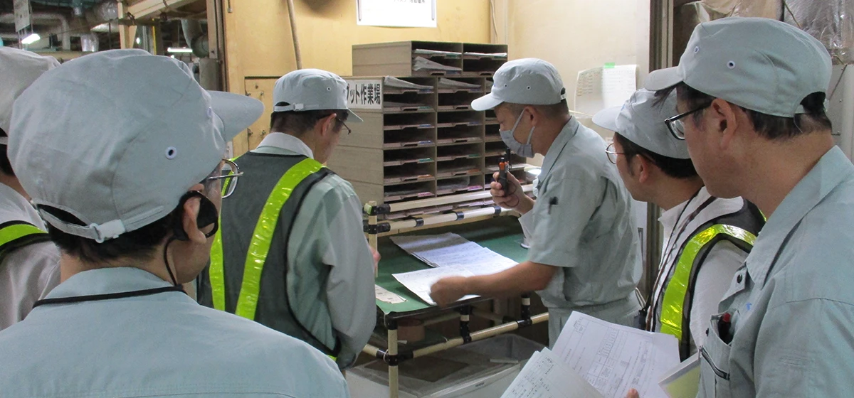 2025年度からの第13次計画では「運用と改善」の3カ年と位置付け、マネジメントシステムの運用継続による問題・課題解決に取り組みます。2028年度からの第14次計画へ向けたさらなるレベルアップを図るべく、ものづくり変革への仕掛けとして、ジャストインタイム※1と自働化※2に取り組んでいます。全社の横展開へのさきがけとしてモデル工場でのトヨタ生産方式TPS研修会およびものづくり改善塾をスタートさせています。